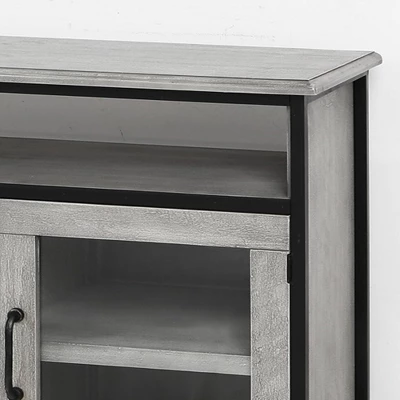 - Cabinet has two doors, one drawer, one open middle shelf, and one open top shelf.