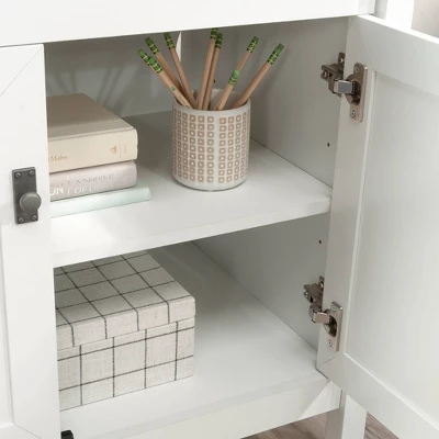 In need of a little extra storage space to complete your home office or workspace? This library cabinet can accommodate that assignment! Build a setting with the storage space you need while incorporating the style that you desire with this library base cabinet from the Cottage Road collection. Behind its two framed doors is a closed storage area that includes a large adjustable shelf that can move to different heights, creating flexible storage for various items you wish to hide away. This space is ideal for stowing away items such as stacks of manuals, work binders, printer cartridges, and so much more! This 2-door storage cabinet also features a pull-out drawer with full extension slides for easy access of miscellaneous office supplies. A library storage cabinet that features a durable, 1″ thick top with a spacious surface is also perfect for displaying your favorite home décor like your collection of knick-knacks, awards, decorative plants, and framed family photos. It’s finished on all sides for flexible room placement, and it also meets BIFMA testing standards for durability and structural performance. Finished in white with Lintel Oak accented top, this handy office storage cabinet with drawer isn’t just functional – it’s good-looking too.