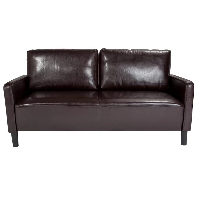 Give your living space that old school, cozy look and feel with this black LeatherSoft upholstered sofa with extended side panels. Generously padded with with 4.5 inches of CAL 117 fire retardant foam, this faux leather settee will add a refined look to your home furnishings. The oversized back cushions are removable for cleaning and have a hook and loop system to keep them in place. The fixed seat cushions stay in place to prevent slippage for a neat, clean look. Upholstered track arms allow you to relax and relieve pressure from your neck and shoulders. Sinuous steel wire seat springs provide an excellent seating experience while soft and durable LeatherSoft upholstery adds warmth and comfort that will make guests feel welcome. High rounded black plastic legs not only enhance the look of this 3 seater couch, they also make it easier to sweep, mop or vacuum underneath. Spills and other messes clean up easily with a water based cleaner. Pair with our glass coffee table to complete the look. Additional Features: Generously Padded with CAL 117 Fire Retardant Foam, Sinuous Steel Wire Seat Springs for a comfortable seating experience, Rounded Black Plastic High Legs makes it easy to sweep or vacuum underneath, Spot Clean with Water Based Cleaner to remove spills, LeatherSoft is leather and polyurethane for added Softness and Durability