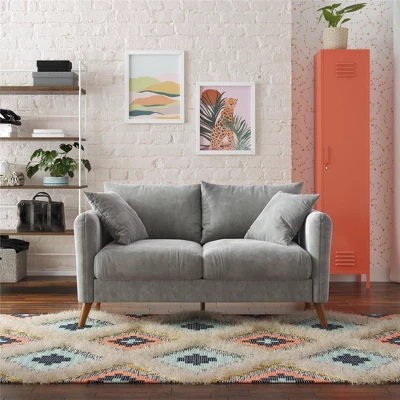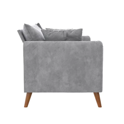 - The loveseat’s pillow back construction, slim rounded club arms, and slanted wood grain finished legs offer a casual feel while its glam velvet upholstery and airy silhouette rev up the charm factor. Pair with the matching 3-seater sofa for extra seating
